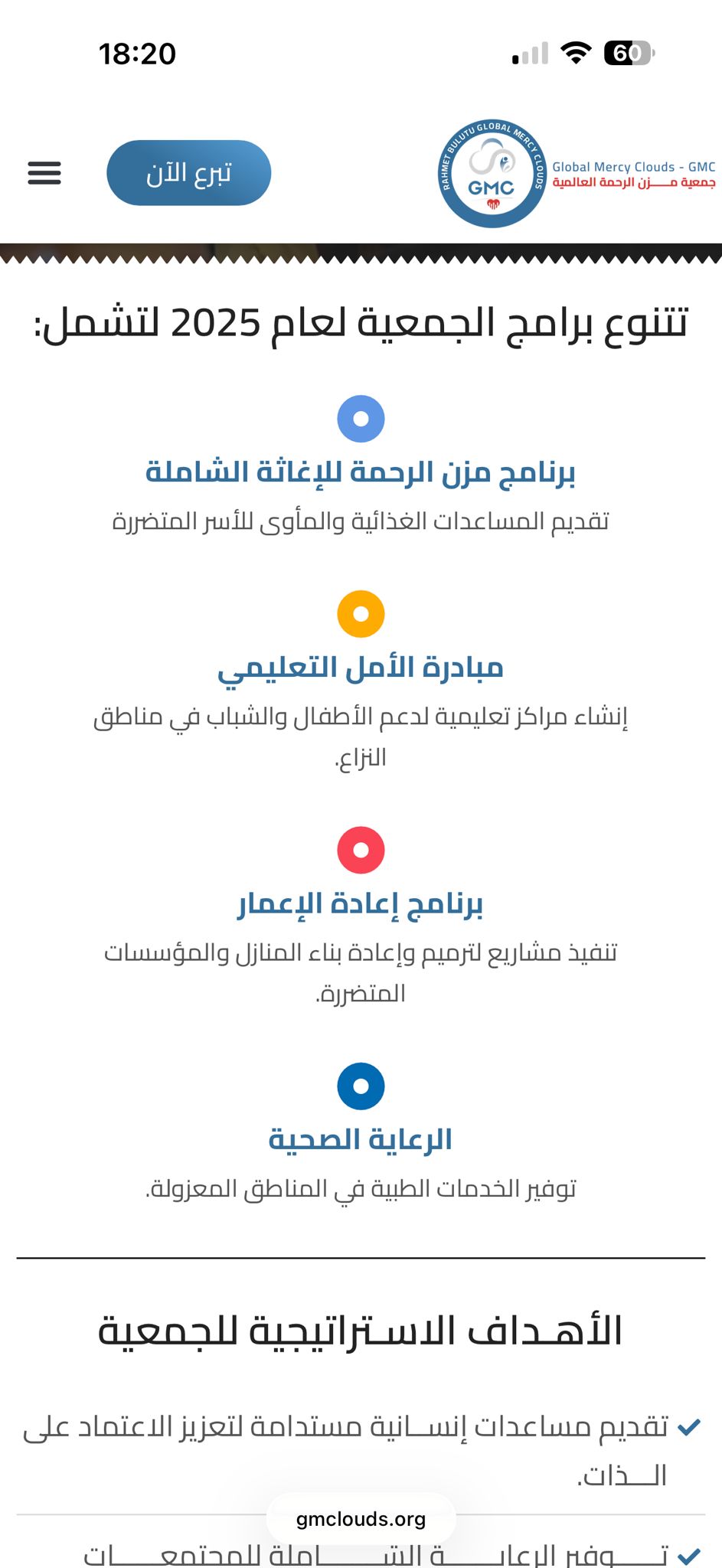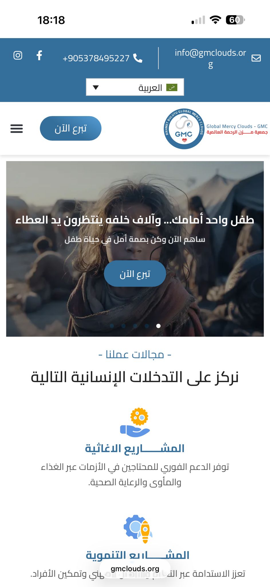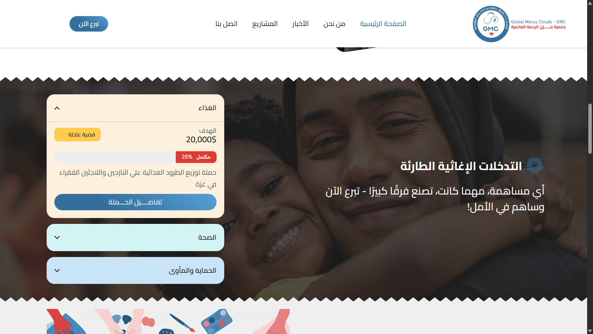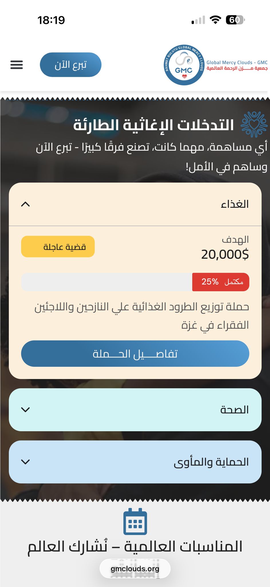 تنظيم واضح للحملات العاجلة مع سهولة الوصول لمعلومات التبرع.
