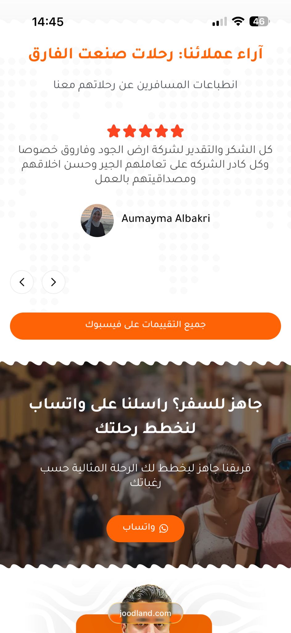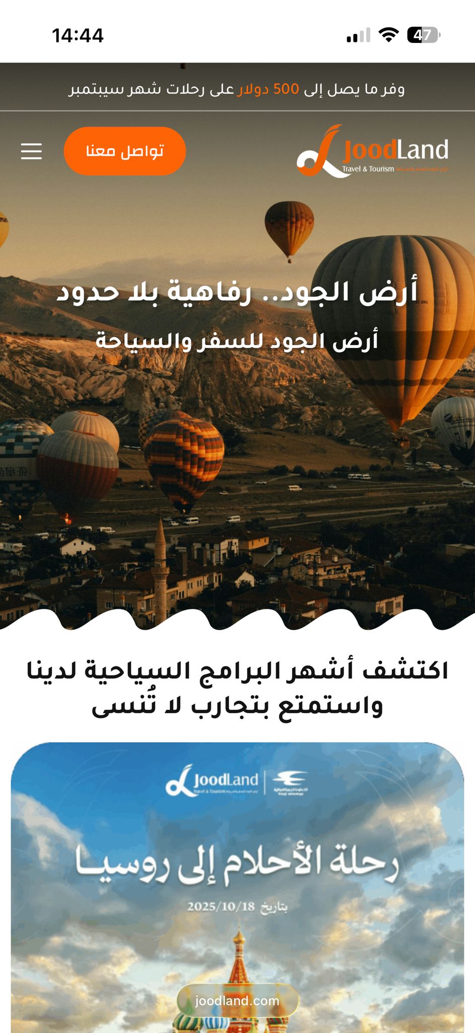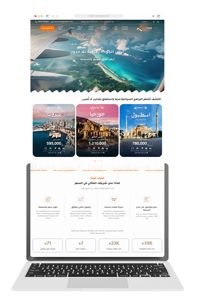 تواصلت شركة JoodLand للسفر والسياحة مع أسترا ميديا بهدف إنشاء موقع إلكتروني احترافي يعرّف بخدماتها السياحية، ويعرض باقات السفر وبرامج الرحلات بشكل واضح وجذاب، مع تحسين تجربة المستخدم وتعزيز الثقة بالعلامة التجارية.