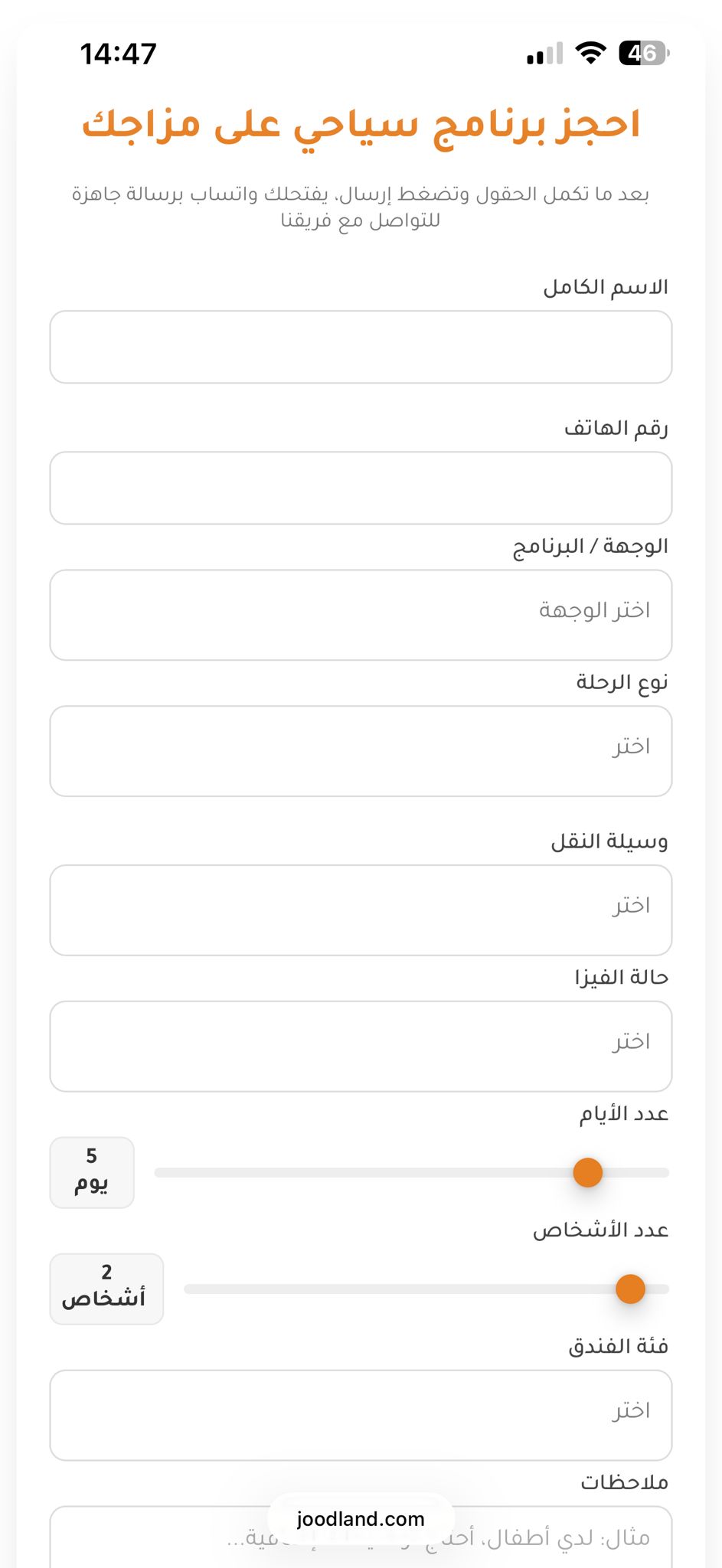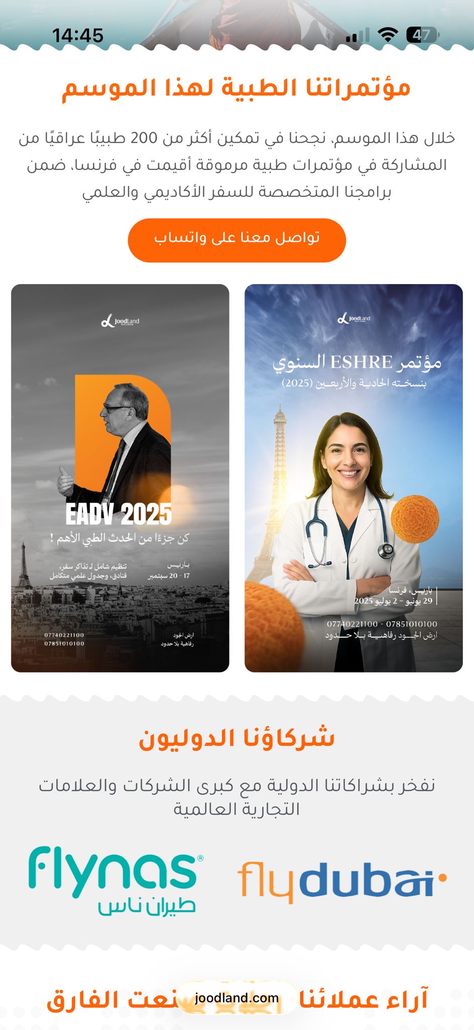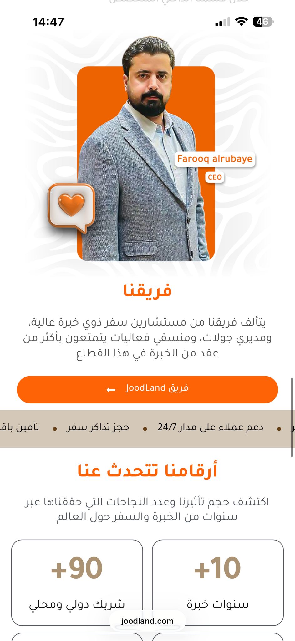 تواصلت شركة JoodLand للسفر والسياحة مع أسترا ميديا بهدف إنشاء موقع إلكتروني احترافي يعرّف بخدماتها السياحية، ويعرض باقات السفر وبرامج الرحلات بشكل واضح وجذاب، مع تحسين تجربة المستخدم وتعزيز الثقة بالعلامة التجارية.