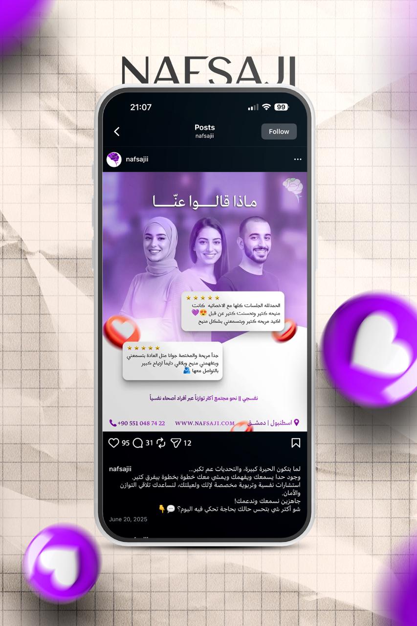 طلبت منصة نفسجي للتمكين النفسي تصميم مواد بصرية لدعم حضورها الرقمي، شملت تصاميم سوشيال ميديا متناسقة مع هوية المنصة، بالإضافة إلى تصميم نماذج تعبئة بيانات واستمارات تُستخدم في الفعاليات مع المستفيدين، مع التركيز على الوضوح وسهولة الاستخدام والطابع الهادئ المناسب للمجال النفسي.